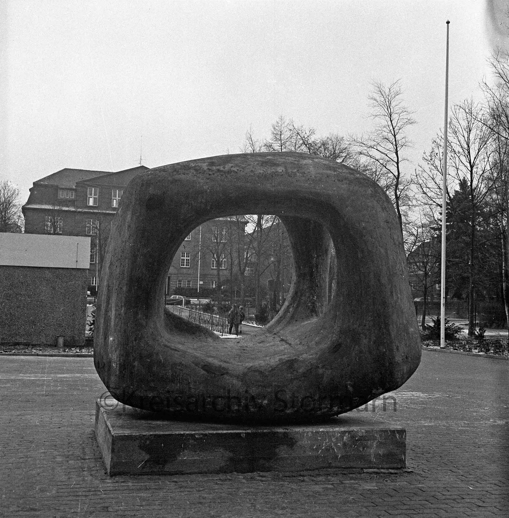 Nordansicht der Betonplastik von Ferdinand Mathiszik: im Hintergrund Gebäude der Theodor-Mommsen-Schule