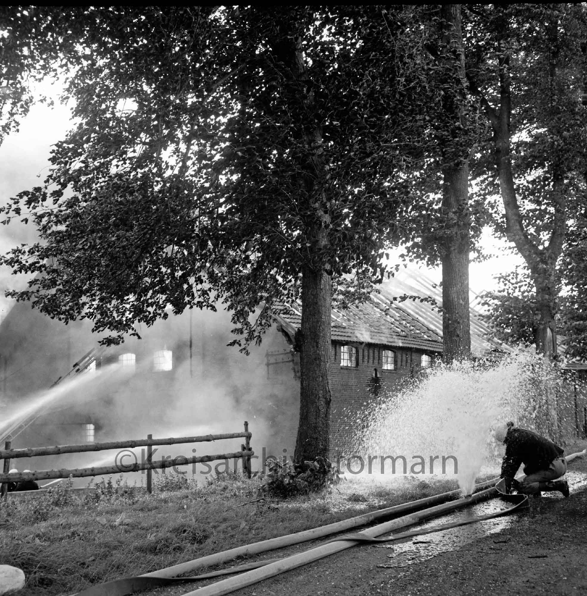 vorne ein geplatzter Wasserschlauch, rechts eine Feuerwehrmann, dahinter das brennende Gebäude