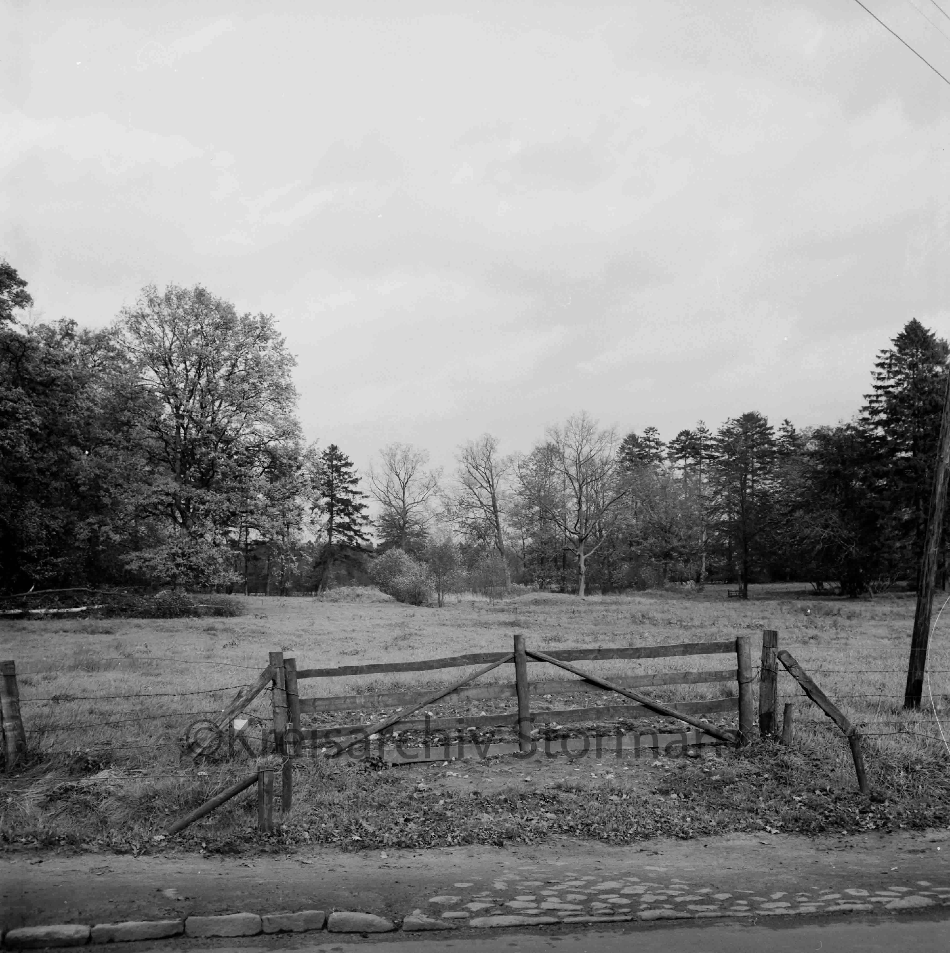 vorn Zaun mit Gatter: dahinter Wiese: hinten Büsche und Bäume