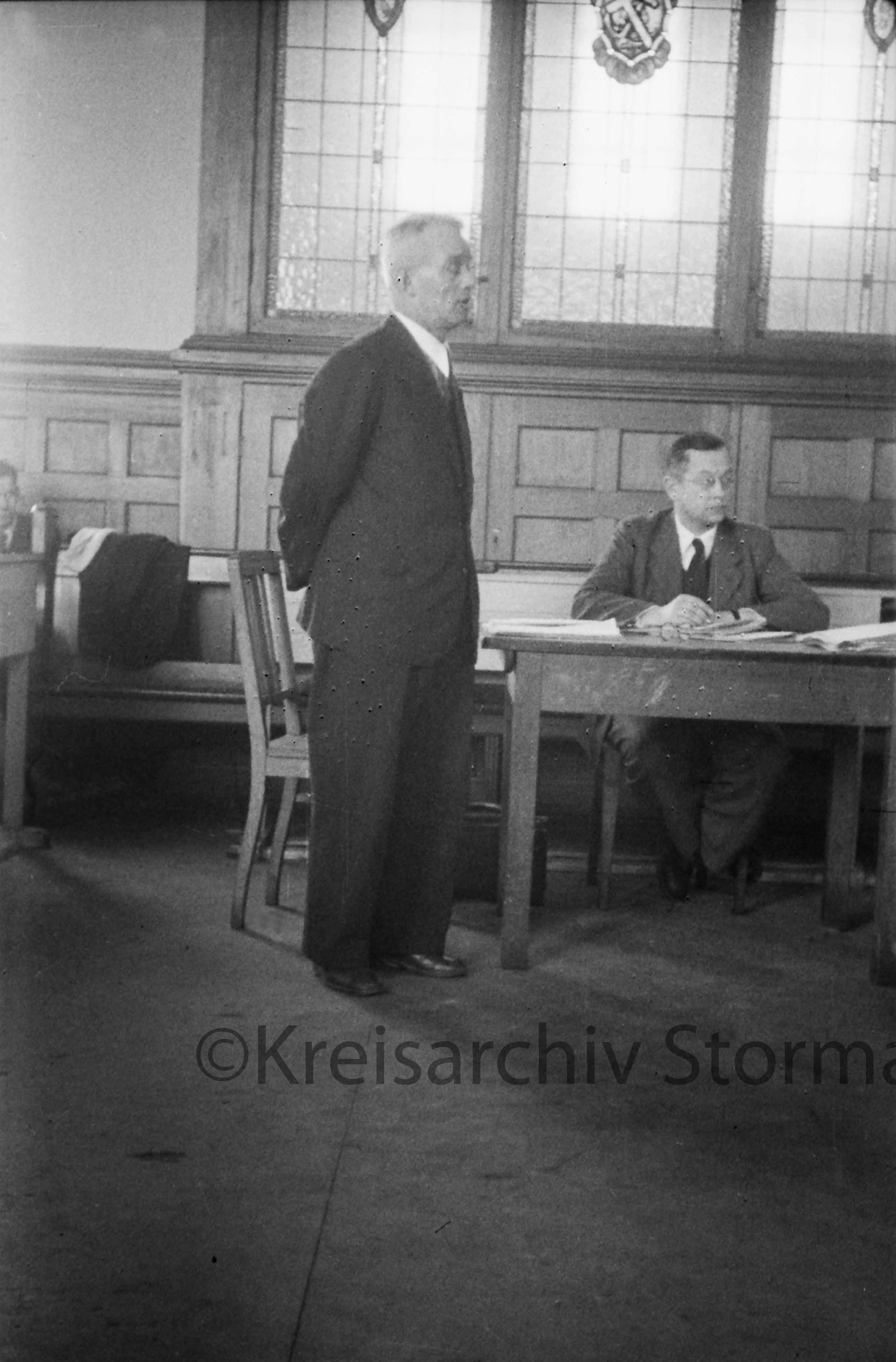 Verhör von ehemaligem : Ausschussmitglied an Tisch: Raum mit Holzvertäfelung, Bleiglasfenster