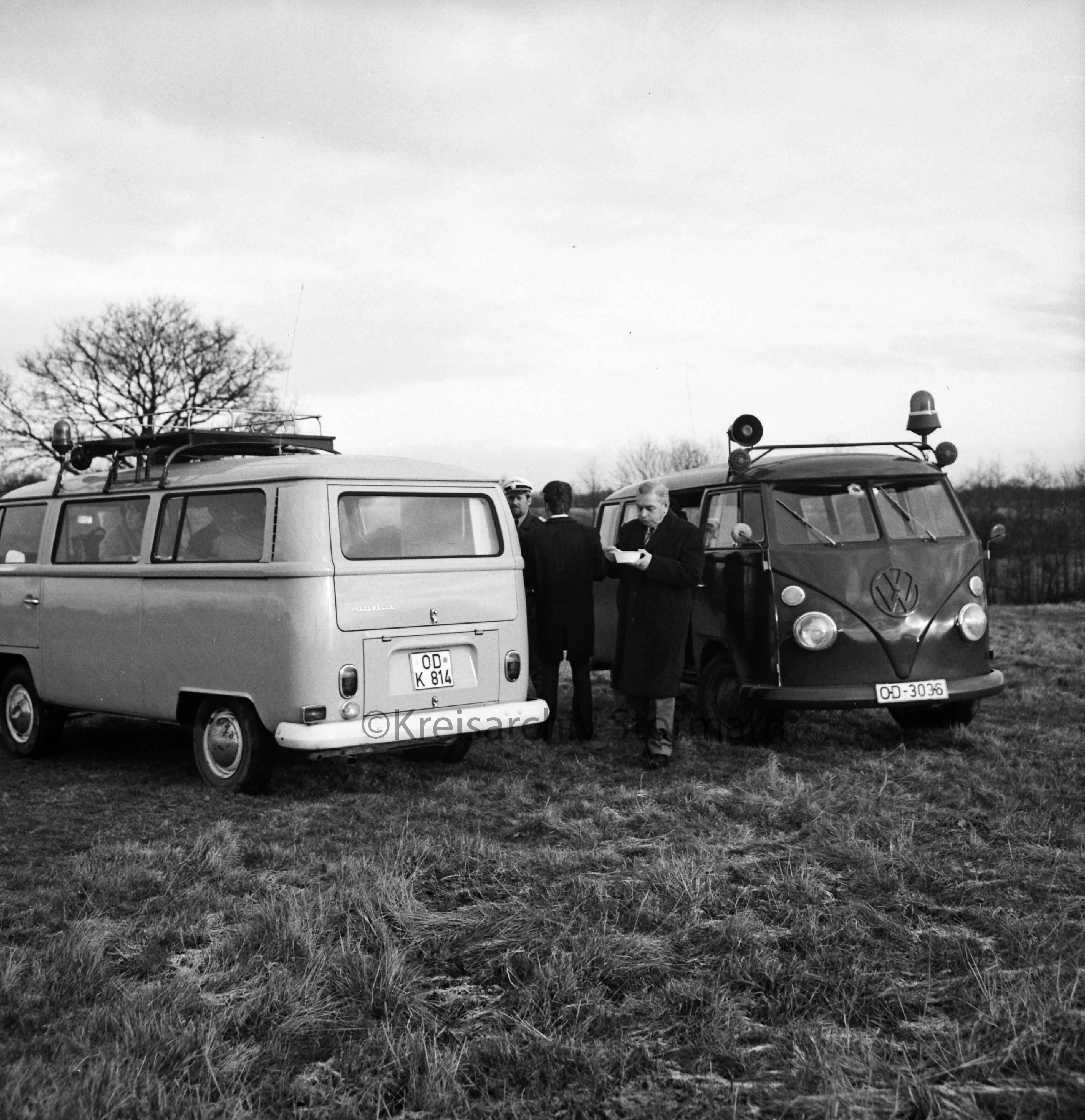 Leichenfund in Wassergraben in der Feldmark zwischen Stemwarde und Stellau: Wiese mit zwei Polizeikleinbussen der Kriminalpolizeistelle Bad Oldesloe: dazwischen Polizeibeamte bei einem Imbiss: dahinter Bäume