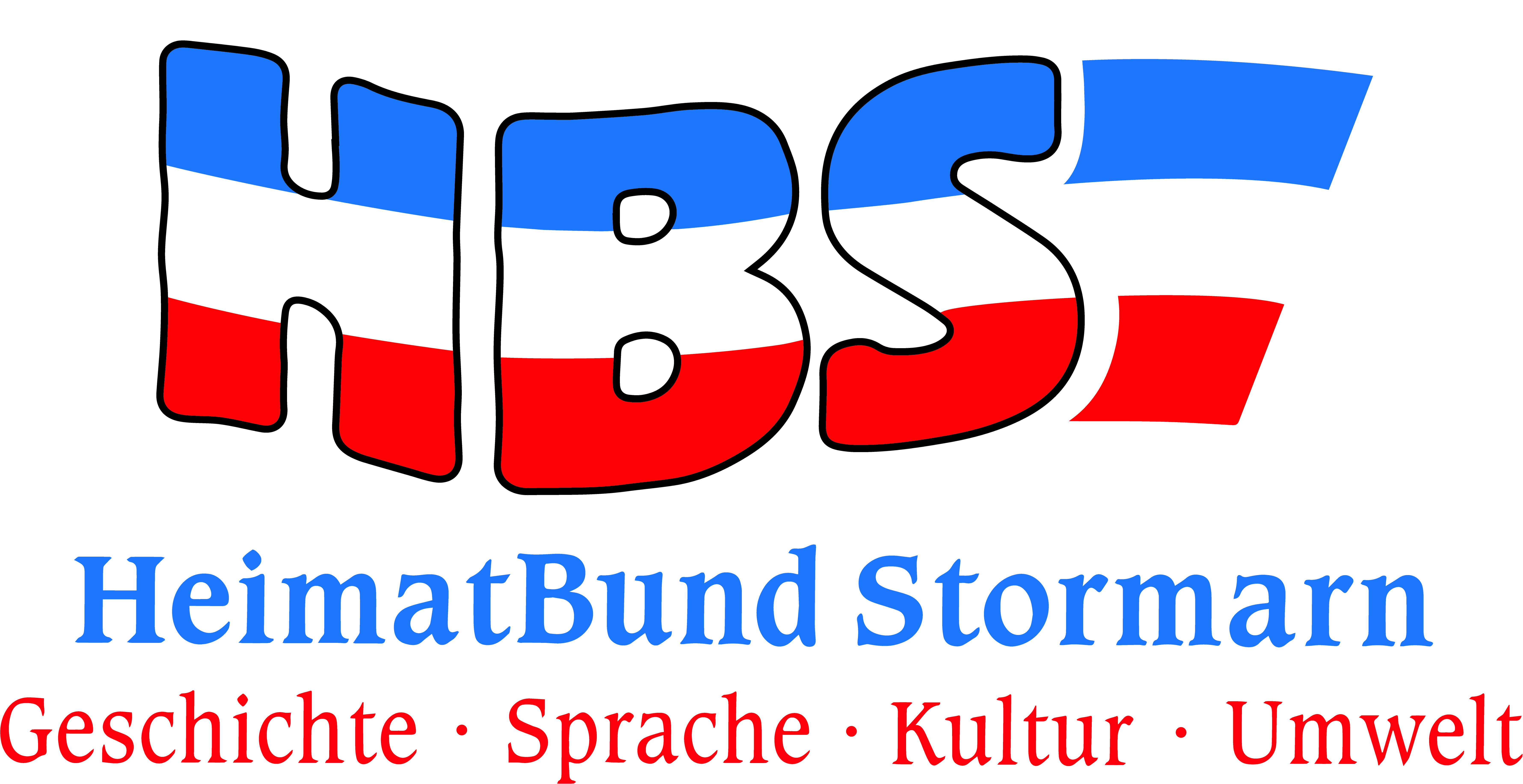 Initialen dreifarbig in Blau Weiß Rot jeweils gestreift, darunter Schriftzug "Heimatbund Stormarn" in Blau und in der zweiten Zeile darunter in Rot der Zusatz "Geschichte Sprache Kultur Umwelt"