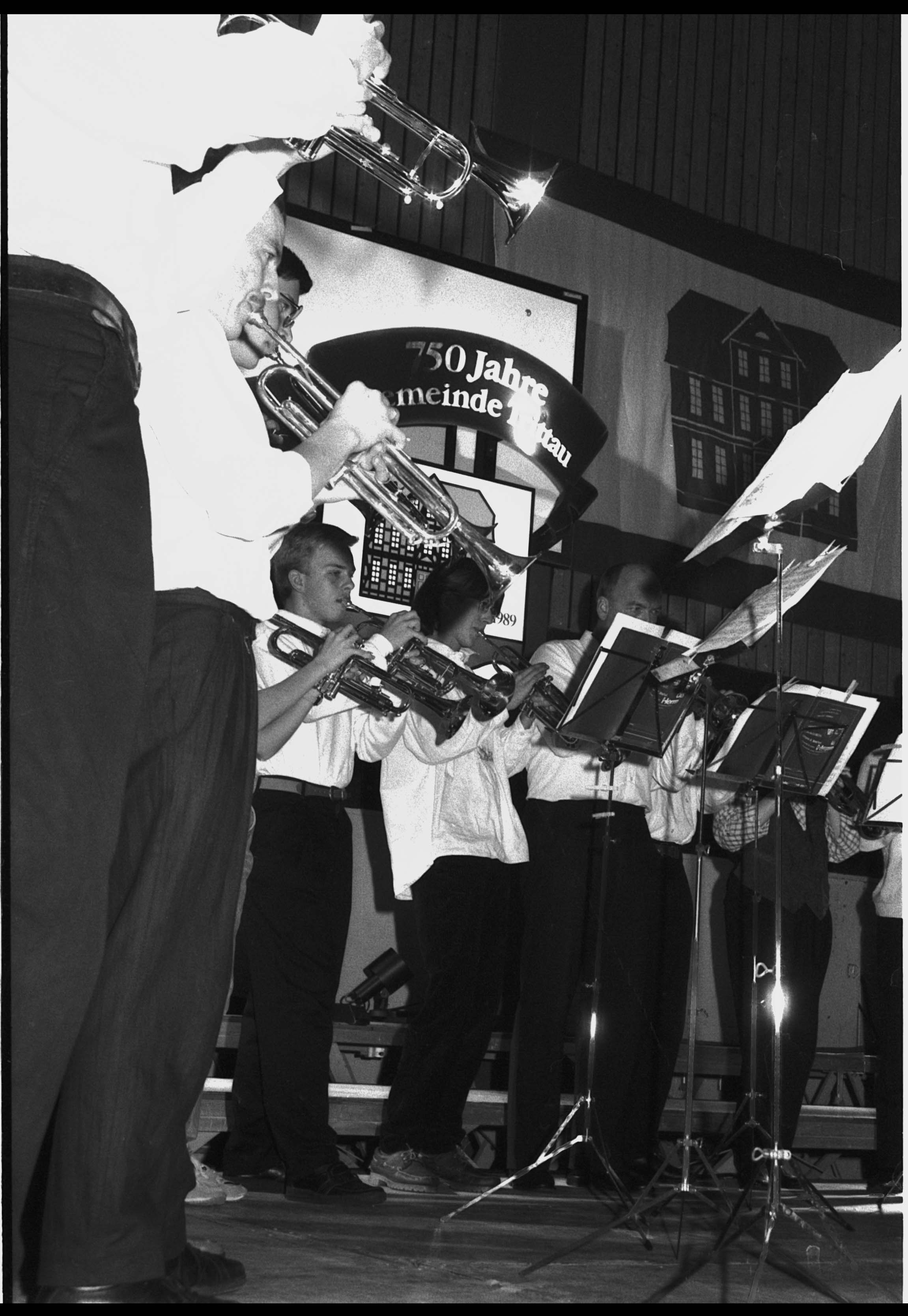 Sporthalle: Bühne: Bläsergruppe bei Darbietung: Notenständer, hinten Gemeindeflagge